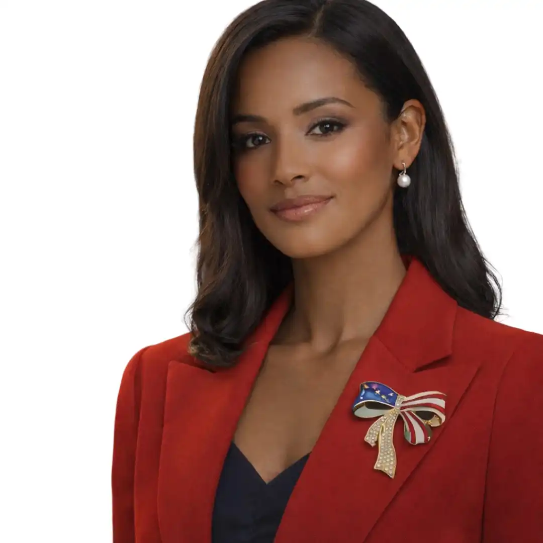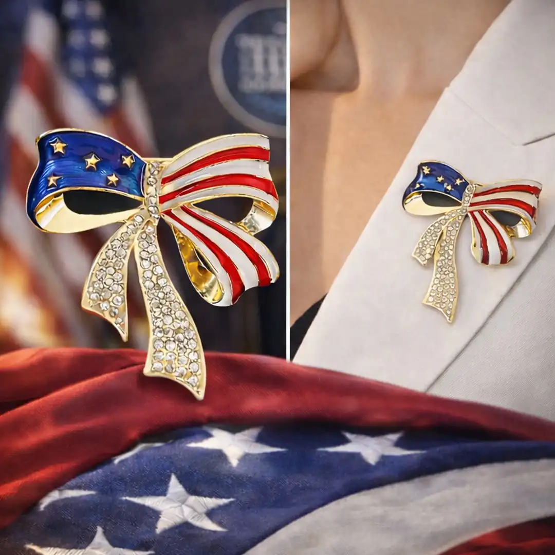 Inspired by presidential-level fashion and classic American style, this bow-shaped brooch blends softness with strength. The flowing ribbon design represents unity and grace, while the American flag detailing honors national pride and heritage.