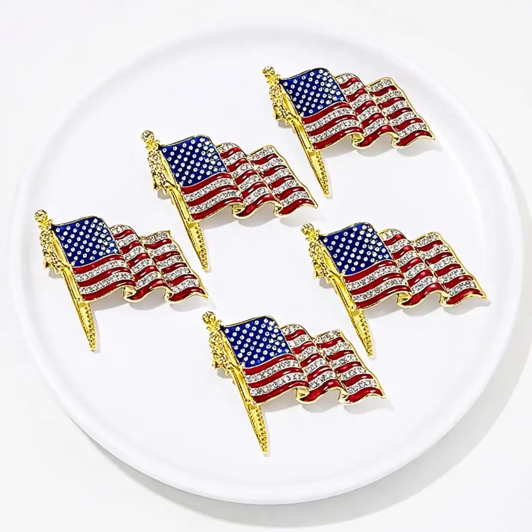 Featuring the iconic Stars and Stripes, this American flag brooch is adorned with brilliant rhinestones set in a radiant gold-tone finish, creating a bold and distinguished look. Whether worn at formal events or special celebrations, it reflects strength, pride, and American heritage.