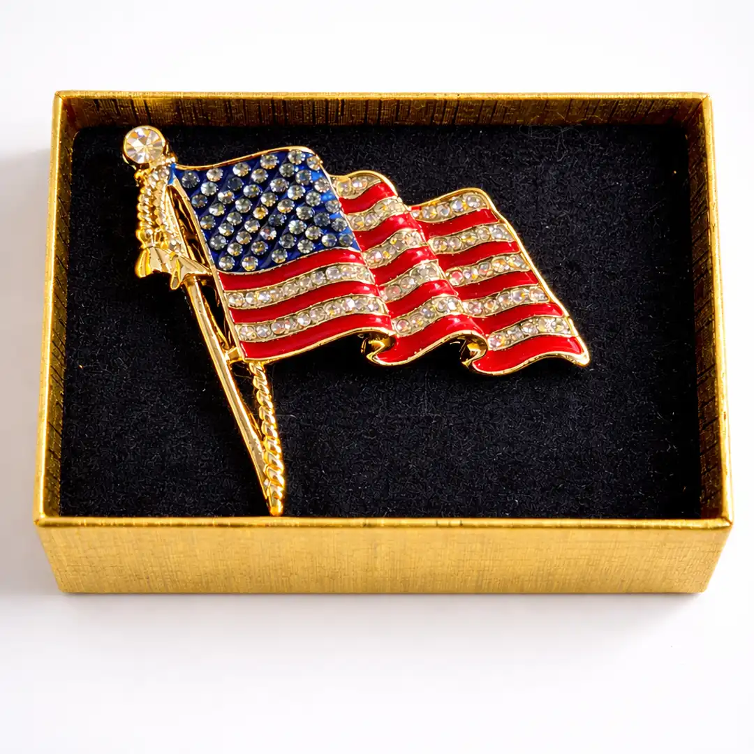 This gold American flag brooch is crafted for individuals who want their accessories to stand out with meaning and style. Its classic yet eye-catching design makes it perfect for formalwear, ceremonies, and collectible displays.
