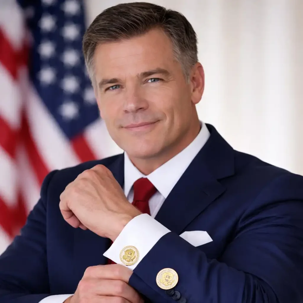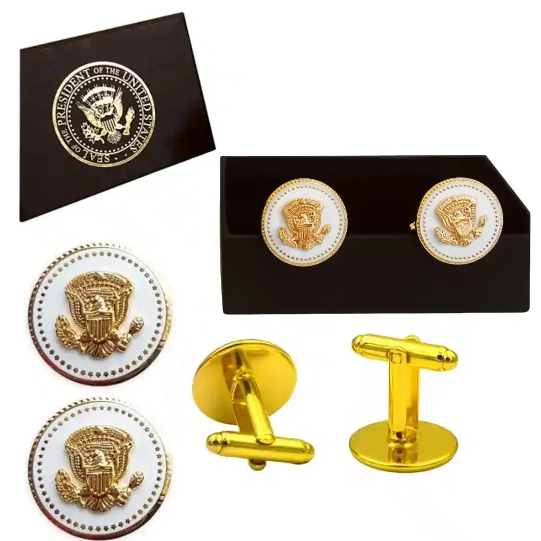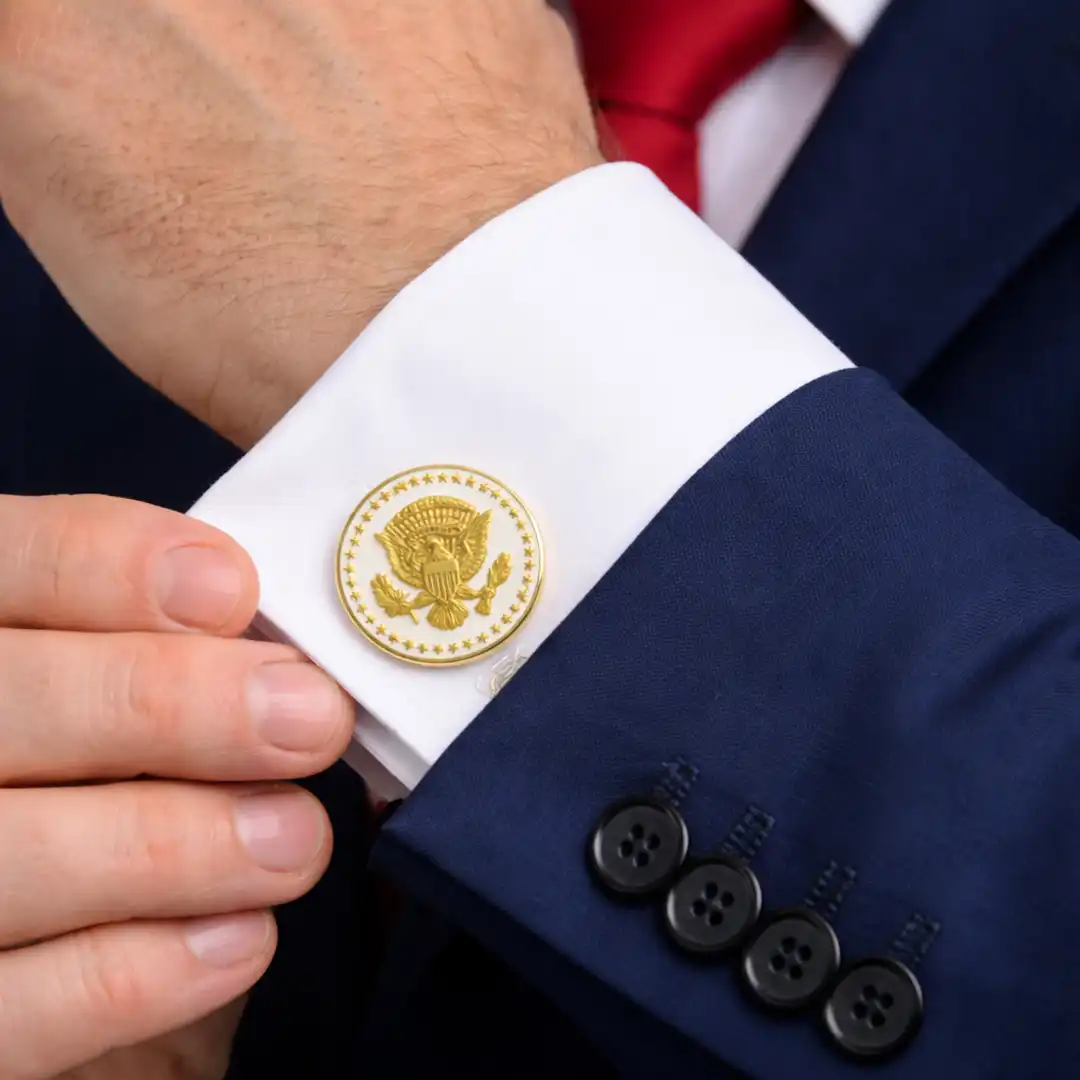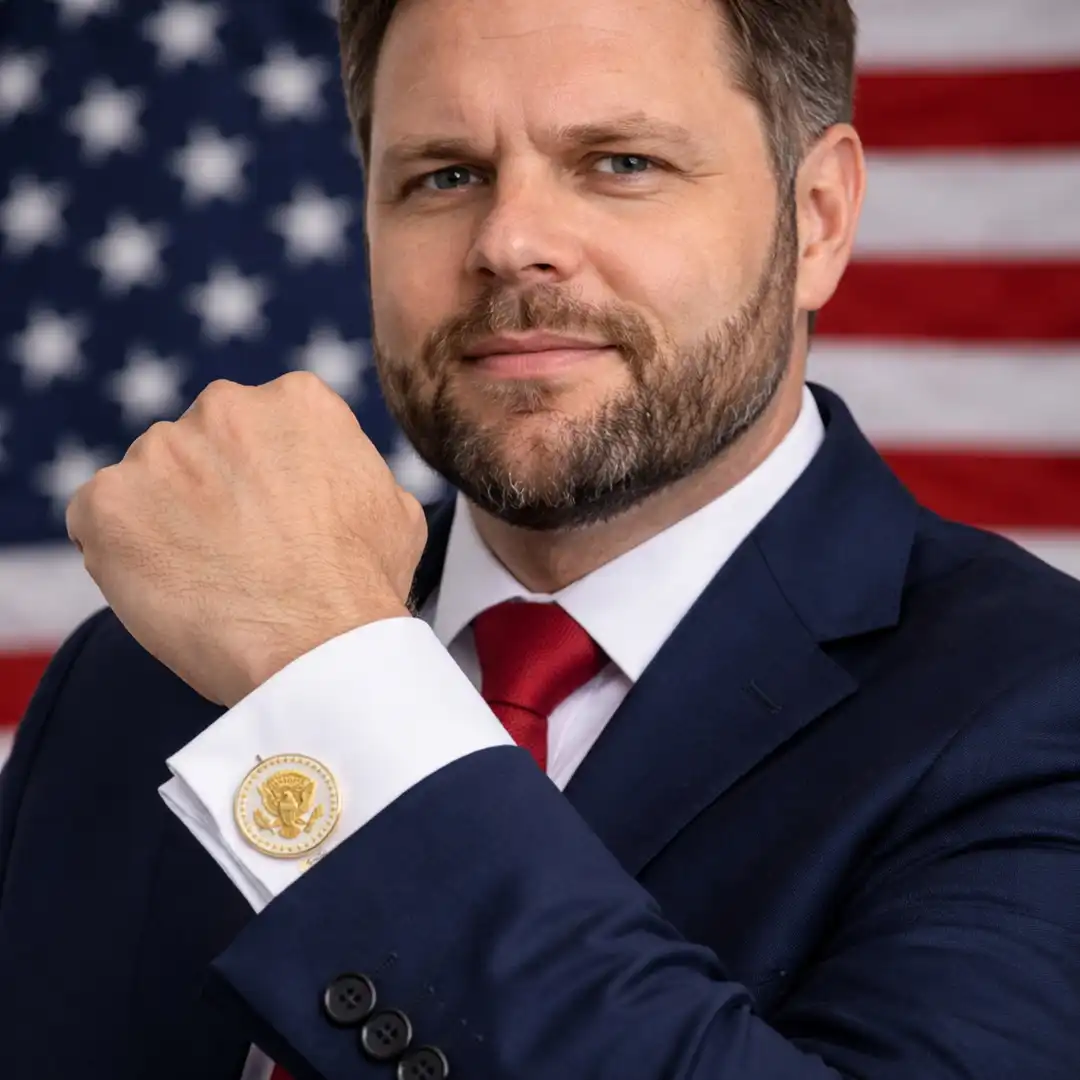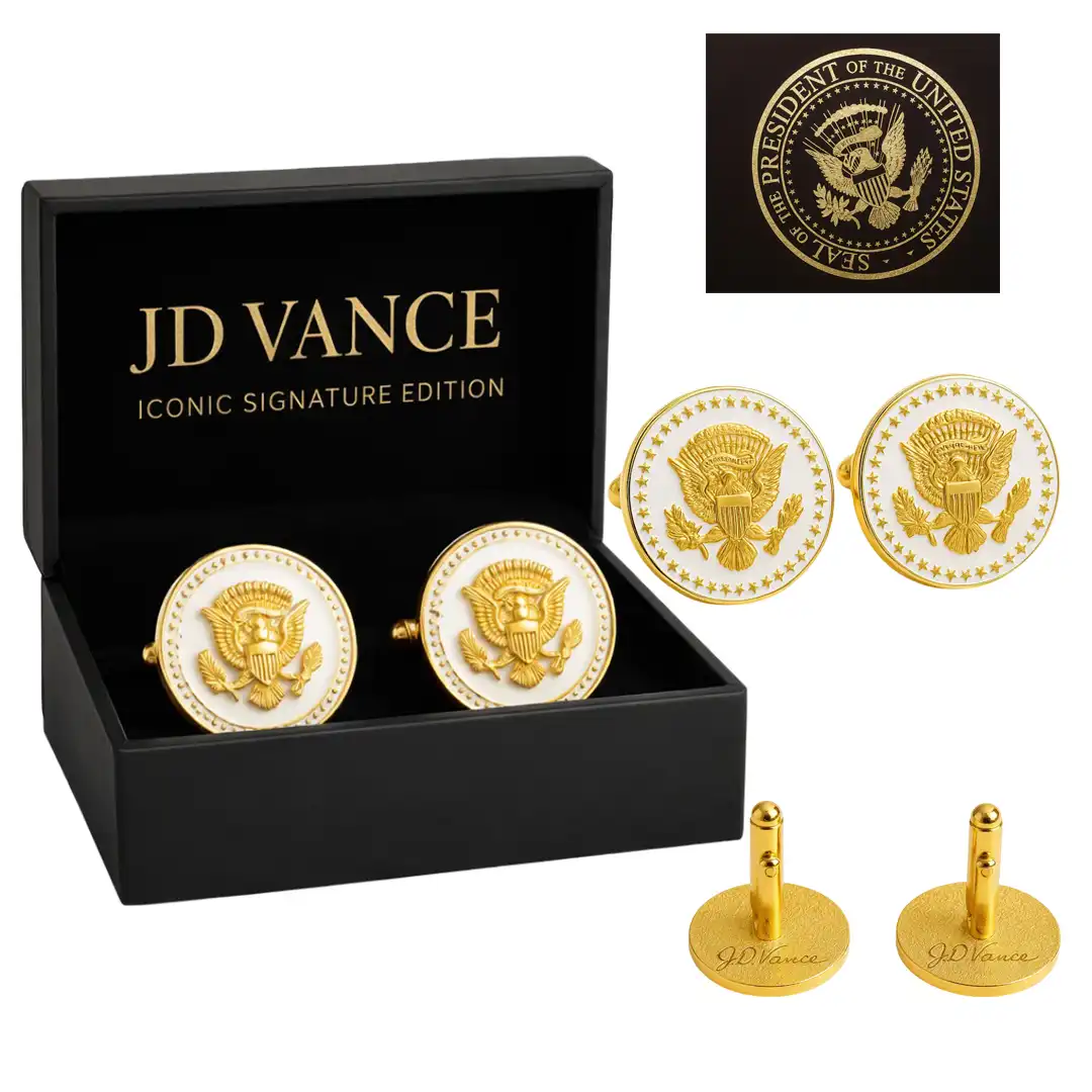 JD Vance Signature cufflinks for men, featuring a design inspired by the Vice President’s distinguished style. These luxurious mens cufflinks are adorned with the Presidential Eagle Seal, encircled by a ring of stars and framed in a timeless rope border, symbolizing power and tradition. Each pair is meticulously crafted with 24K gold plating, delivering a refined look that elevates any formal occasion.
