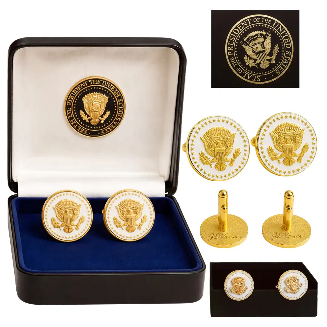 The reverse side of the cufflinks showcases the detailed engraving of JD Vance’s signature, adding a personal and historic touch. Presented in a sophisticated gift box embossed with the Presidential Seal, these men cuff links make the perfect collectible, gift, or display piece.