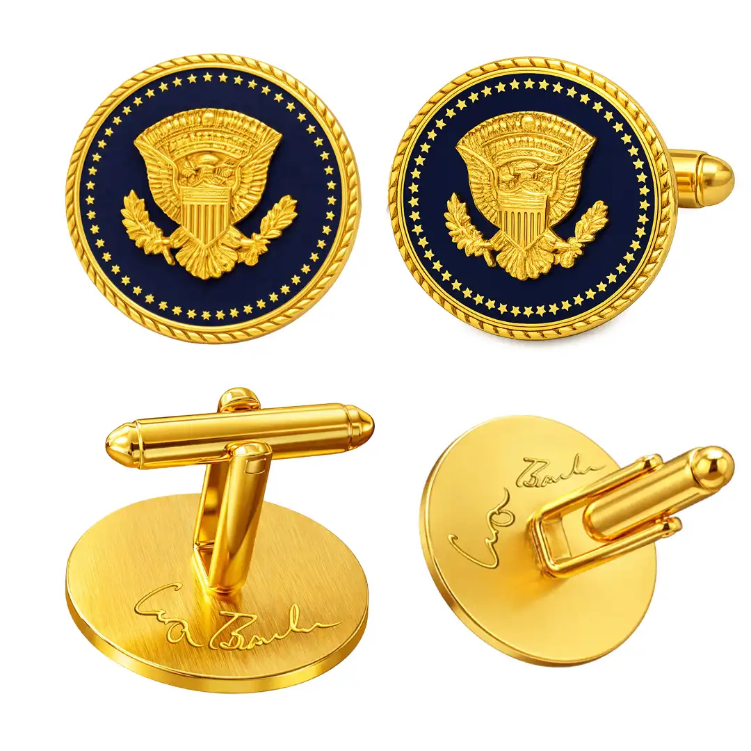 These cufflinks feature the iconic Presidential Seal Eagle, set against a deep cobalt blue enamel center that symbolizes authority, patriotism, and executive leadership. Finished with radiant 24K gold plating, they offer a polished, commanding presence suitable for the most formal occasions.