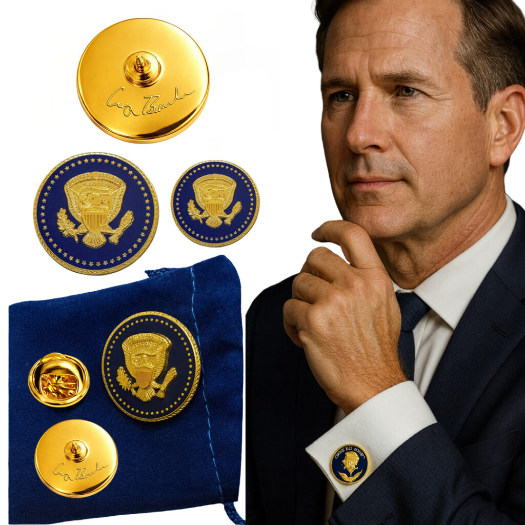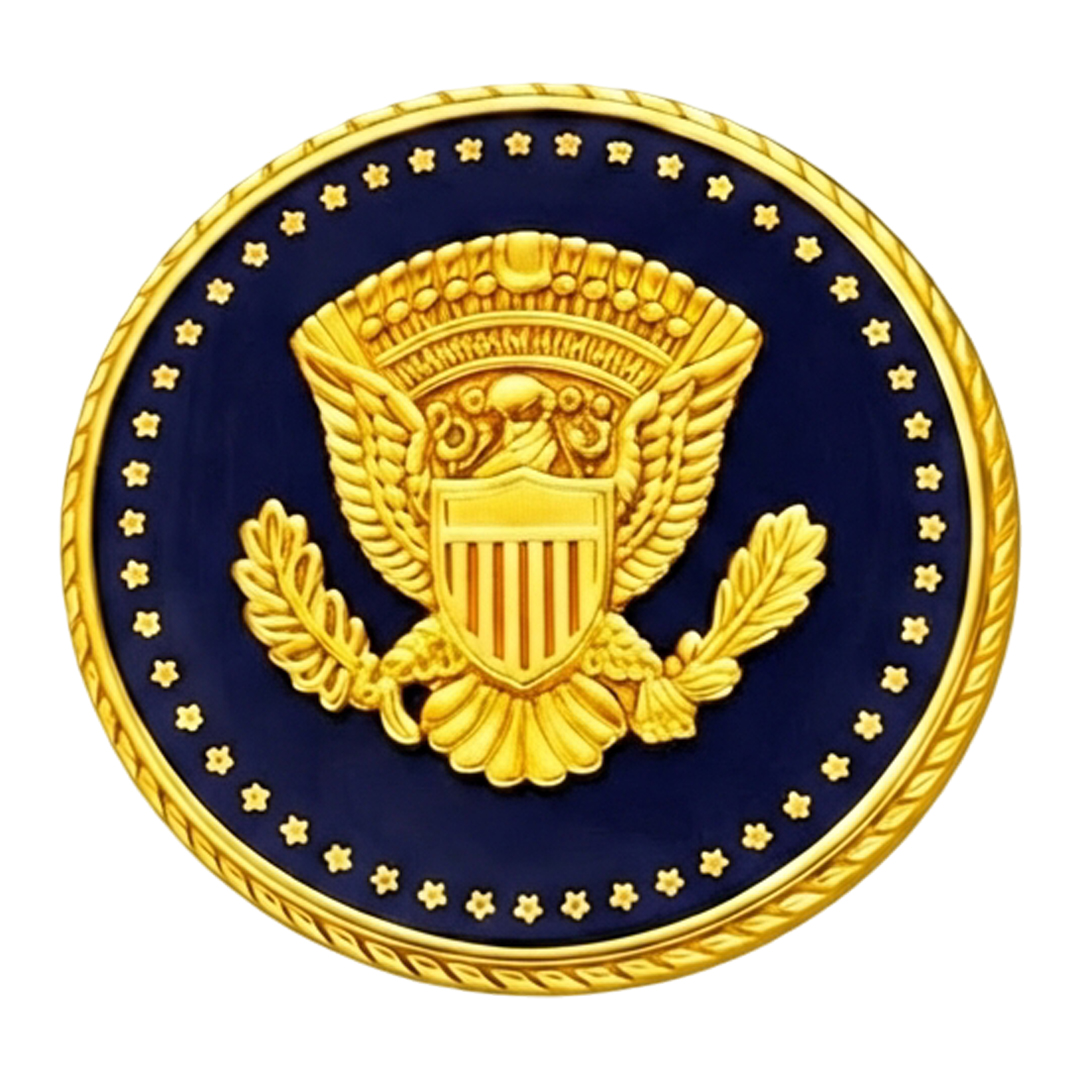 Showcases the iconic Presidential Seal Eagle, surrounded by 50 gold stars on a rich cobalt-blue enamel backdrop, symbolizing unity, leadership, and national pride.