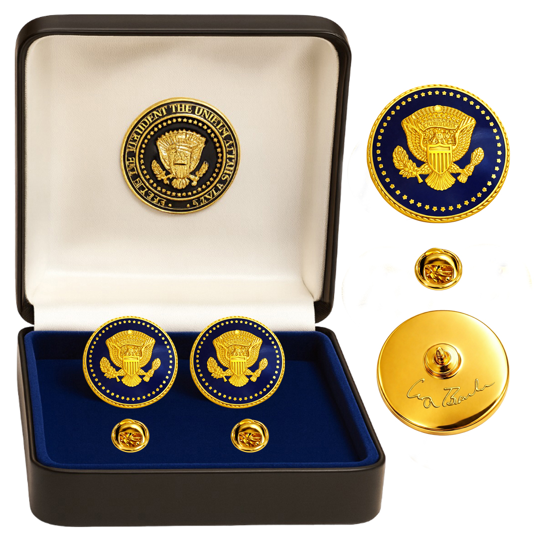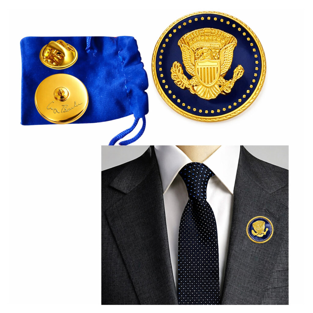 Each lapel pin arrives in a stylish black presentation box, elegantly embossed with the Presidential Seal Eagle in gold, making it perfect for gifting or display.