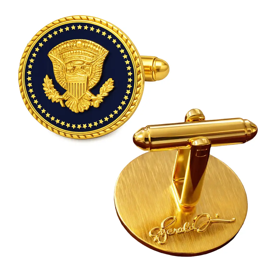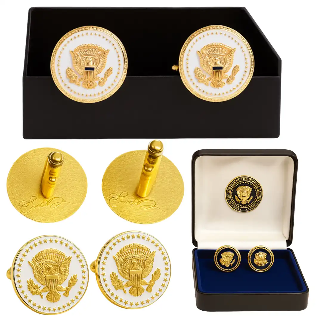 These cufflinks feature the iconic Presidential Seal Eagle, beautifully set against a crisp white cobalt enamel center. Surrounded by symbolic stars and finished with classic rope detailing, the design reflects authority, unity, and national pride. The luxurious 24K gold-plated finish adds brilliance and prestige, making them ideal for formal and ceremonial wear.
