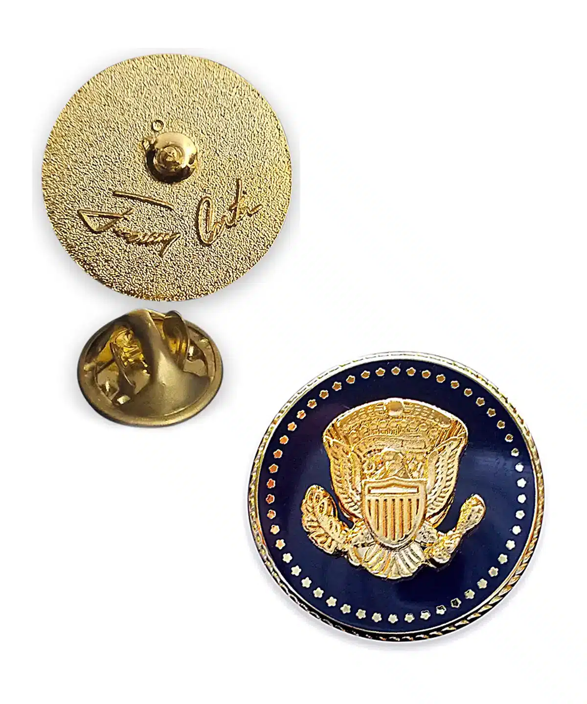 Elevate your style with the exquisite Jimmy Carter Lapel Pin. A true symbol of prestige and craftsmanship. Expertly plated in 24K gold, this eye-catching accessory features the iconic Presidential Eagle. Surrounded by 50 stars against a stunning cobalt blue backdrop. The intricately designed edges showcase a unique 'robe' texture that enhances its luxurious appearance. On the reverse side, President Jimmy Carter’s signature is elegantly engraved, making this piece a memorable collector's item.