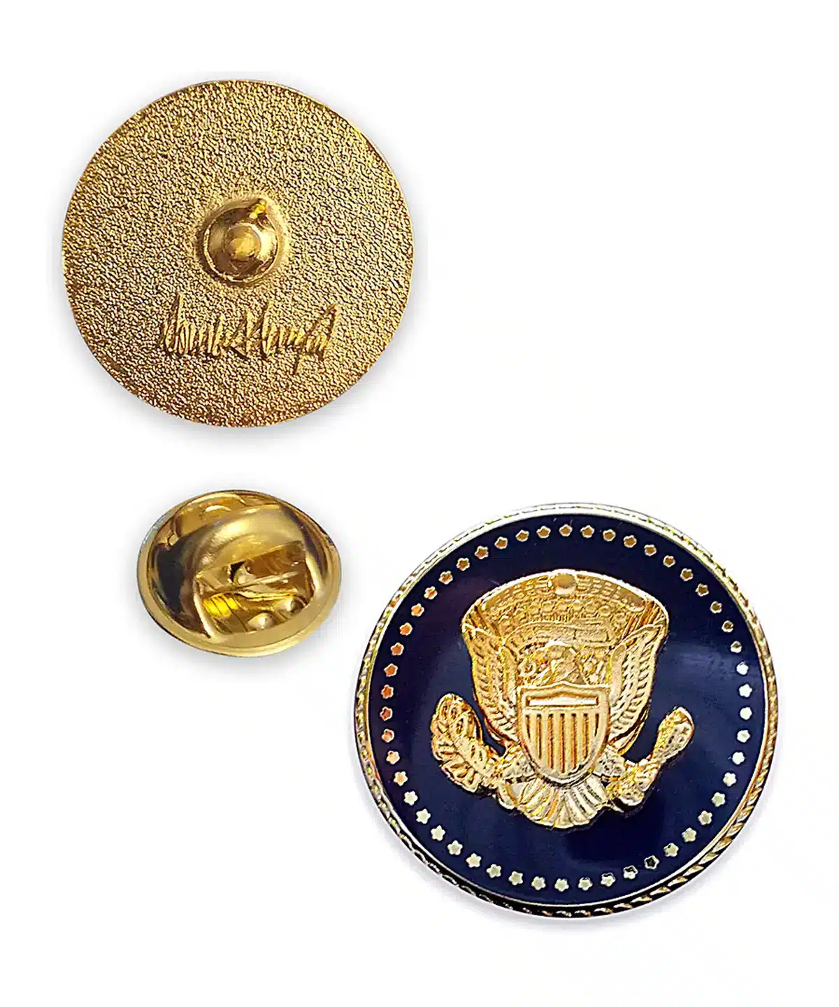 Elevate your style with this stunning Premium Gold Eagle Seal lapel pin, a remarkable piece that embodies elegance and patriotism. The intricate eagle design surrounded by 50 stars against a rich cobalt blue backdrop showcases meticulous craftsmanship, making it an essential accessory for formal events. With a lustrous 24K gold-plated finish, this custom lapel pin adds a touch of sophistication to any outfit. The reverse side features a distinctive engraving of President Donald Trump's signature, highlighting its collectible nature. Each pin is thoughtfully packaged in a luxurious black box adorned with a gold-embossed Presidential Eagle Seal, offering a perfect gifting option for enthusiasts or collectors alike.