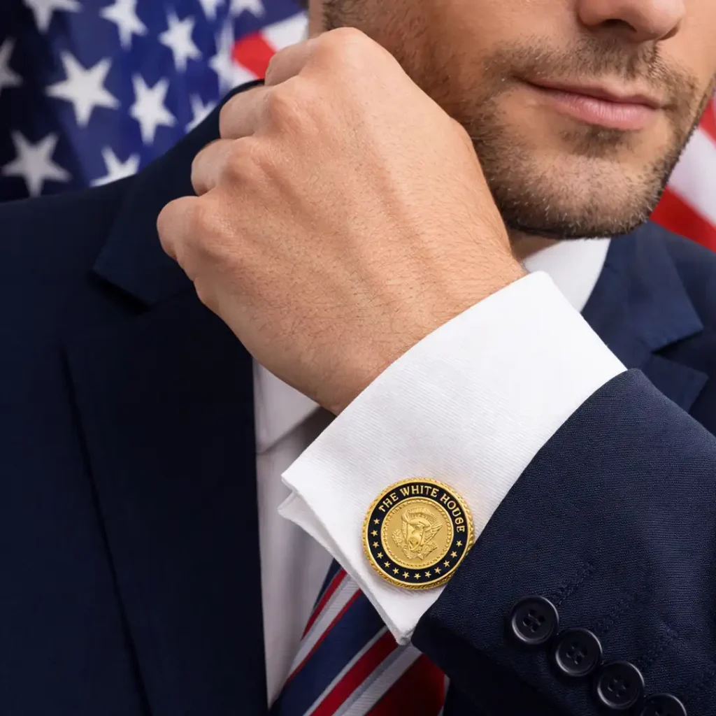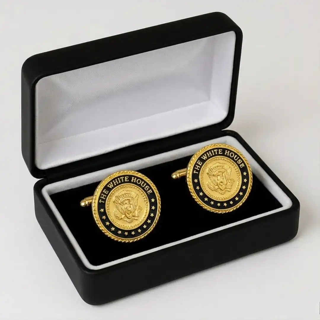 Each pair is presented in an elegant black presentation box embossed with the Presidential Seal, making them ideal for gifting or display. Perfect for formal gatherings, black-tie events, or boardroom appearances, these mens cufflinks deliver lasting quality and a sense of authority.