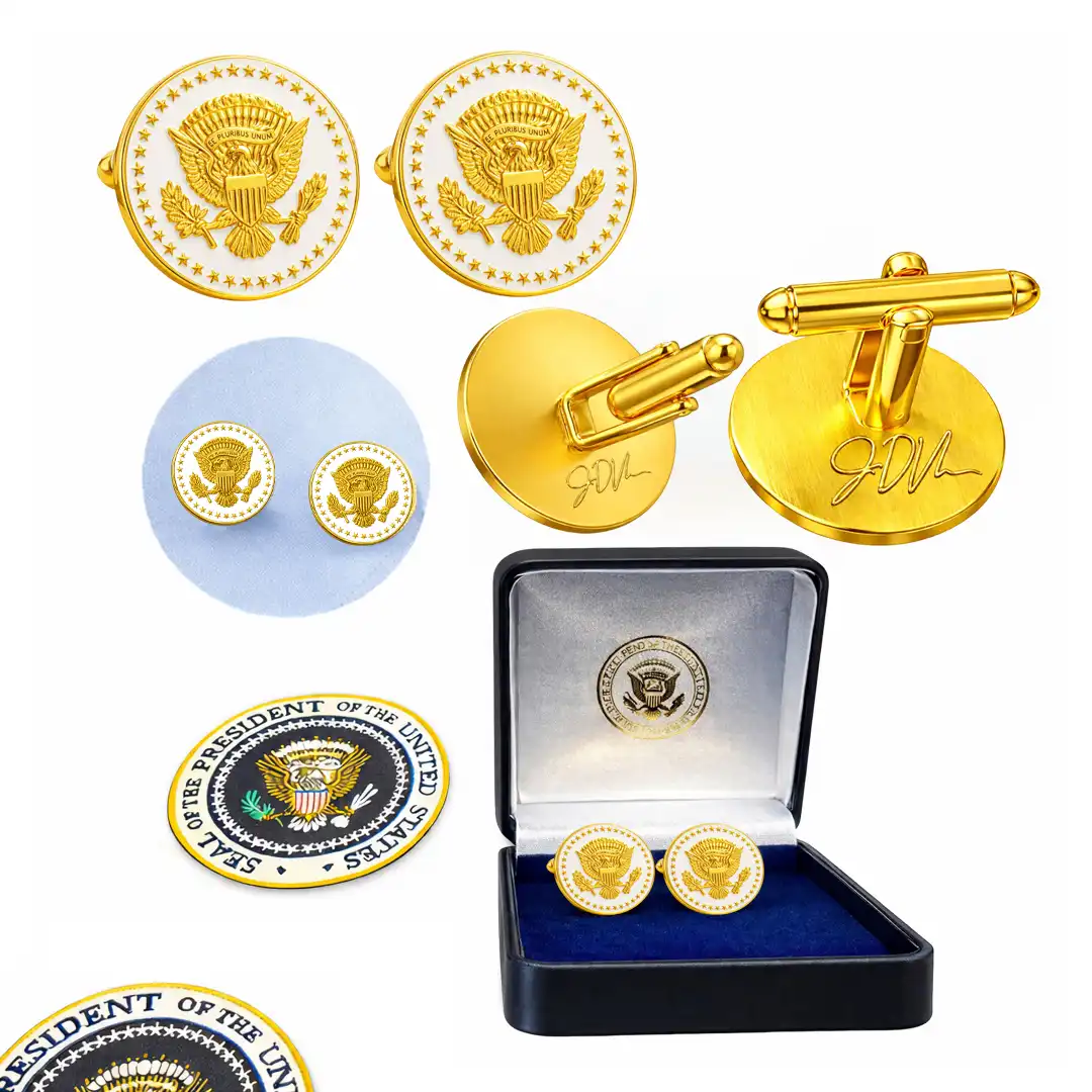 Inspired by presidential tradition and contemporary authority, these cufflinks feature the iconic Vice President Eagle Seal, representing strength, unity, and national pride. Finished in radiant 24K gold plating, they deliver a bold yet elegant statement suited for both ceremonial wear and executive occasions.
